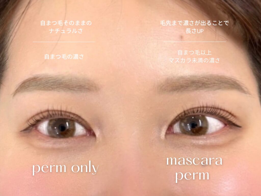 マスカラパーマと従来のまつ毛パーマの違いは、従来のまつげパーマとの決定的な違いは、「自まつげに黒い色を付ける(ティント)」工程があるかどうかです